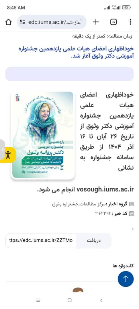 به گزارش روابط عمومی دانشکده فناوریهای نوین پزشکی، فرایند خوداظهاری اعضای هیأت علمی یازدهمین دوره جشنواره آموزشی دکتر پروانه وثوق از تاریخ ۲۶ آبان تا ۱۶ آذر ۱۴۰۴ فعال شد. اعضای محترم هیأت علمی می‌توانند با مراجعه به سامانه جشنواره به نشانی vosough.iums.ac.ir نسبت به ثبت اطلاعات خود اقدام نمایند.
