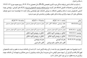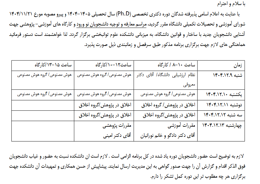 برنامه برگزاری کارگاه و نشست معارفه و توجیه دانشجویان نو ورود دوره دکتری PHD سال 1404