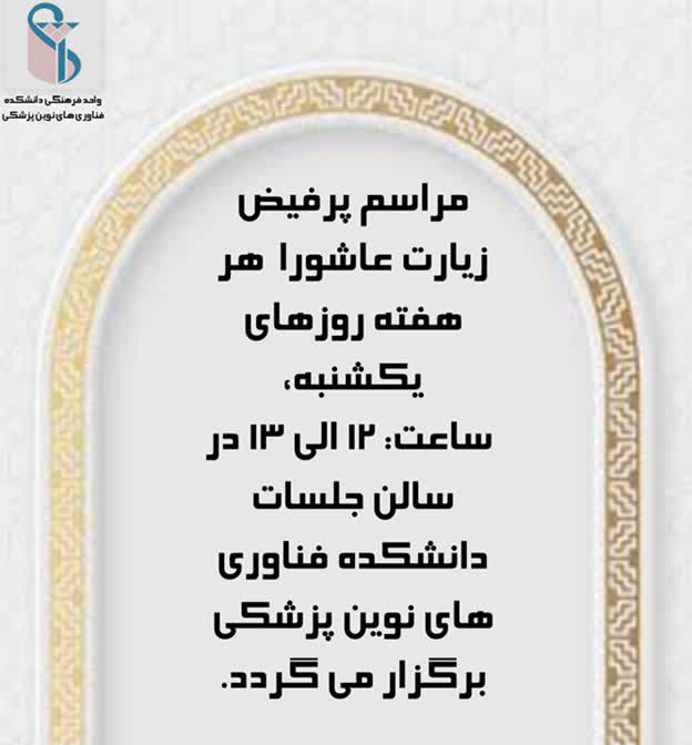 به گزارش روابط عمومی دانشکده فناوریهای نوین پزشکی، مراسم زیارت عاشورا هر هفته یکشنبه ها ساعت 12 تا 13 در سالن کنفرانش دانشکده فناوریهای نوین پزشکی برگزار می گردد.